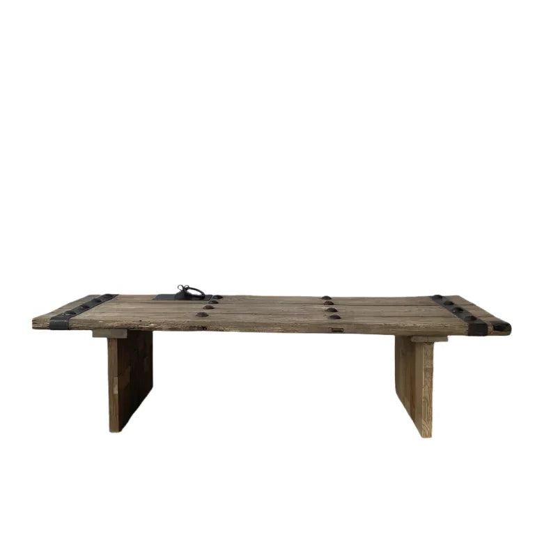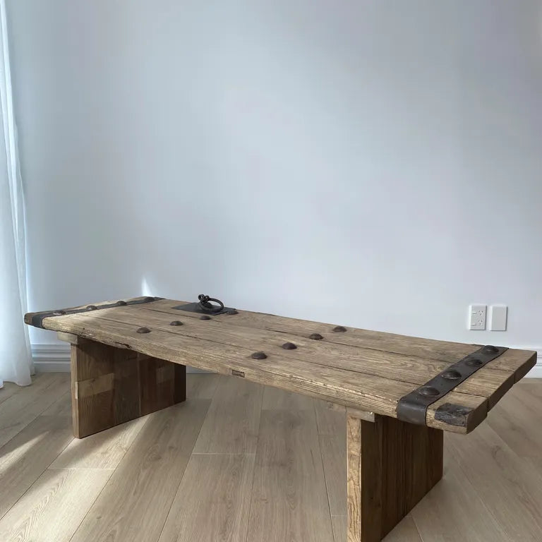 Transform your living room with our Antique Elm Door Coffee Table! Crafted with solid Old Elm and adorned with metal studs, this natural-coloured table is the perfect blend of rustic charm and timeless elegance. Upgrade your space with a touch of vintage sophistication.
