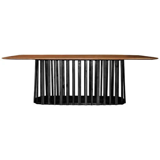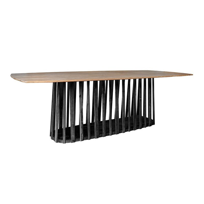 Indulge in the artistic sophistication of the Bell Dining Table - 2400. Crafted from solid teak wood, its sleek design and natural finish exude elegance. The black stained base creates a striking contrast, perfect for urban and modern spaces. Elevate your dining experience with this contemporary masterpiece.