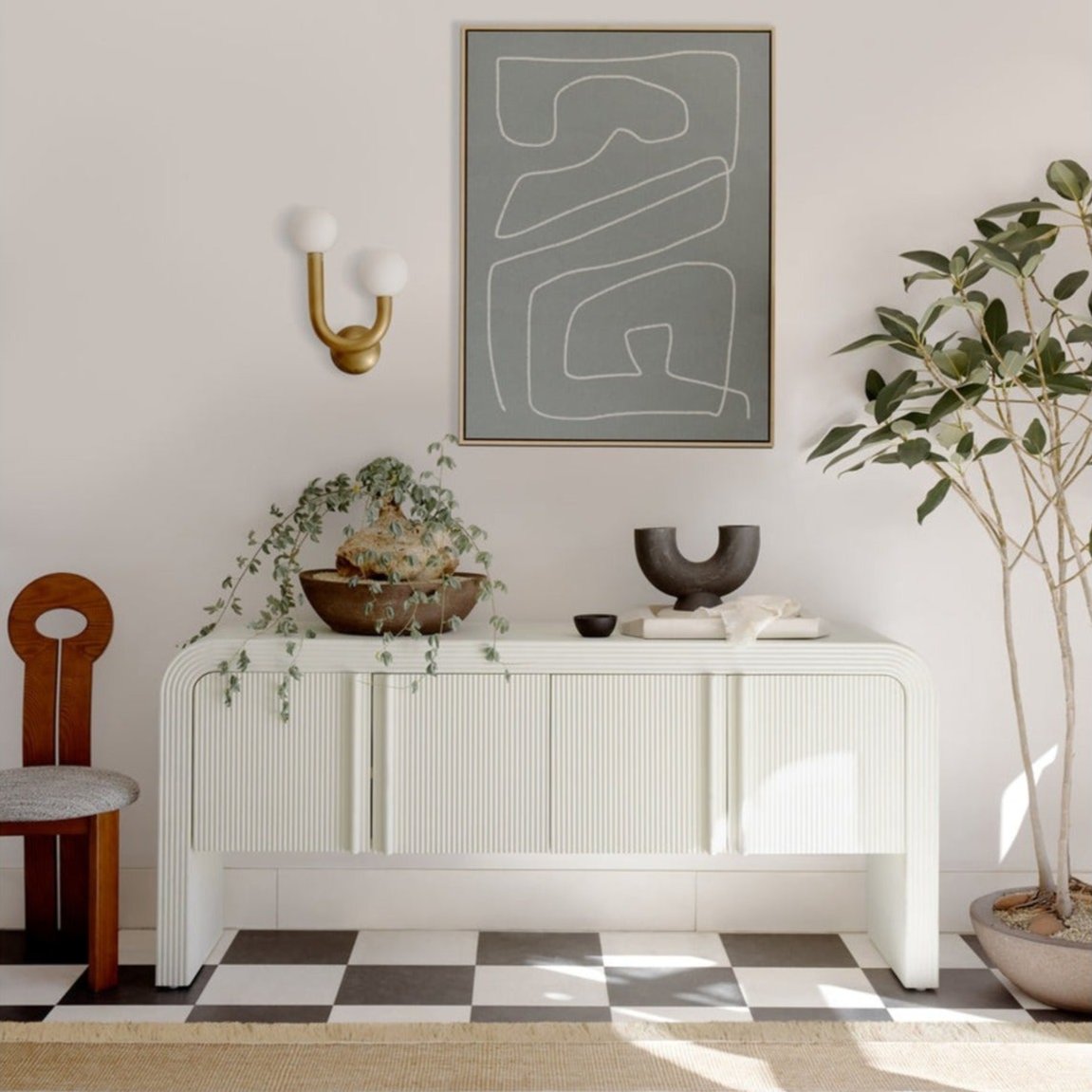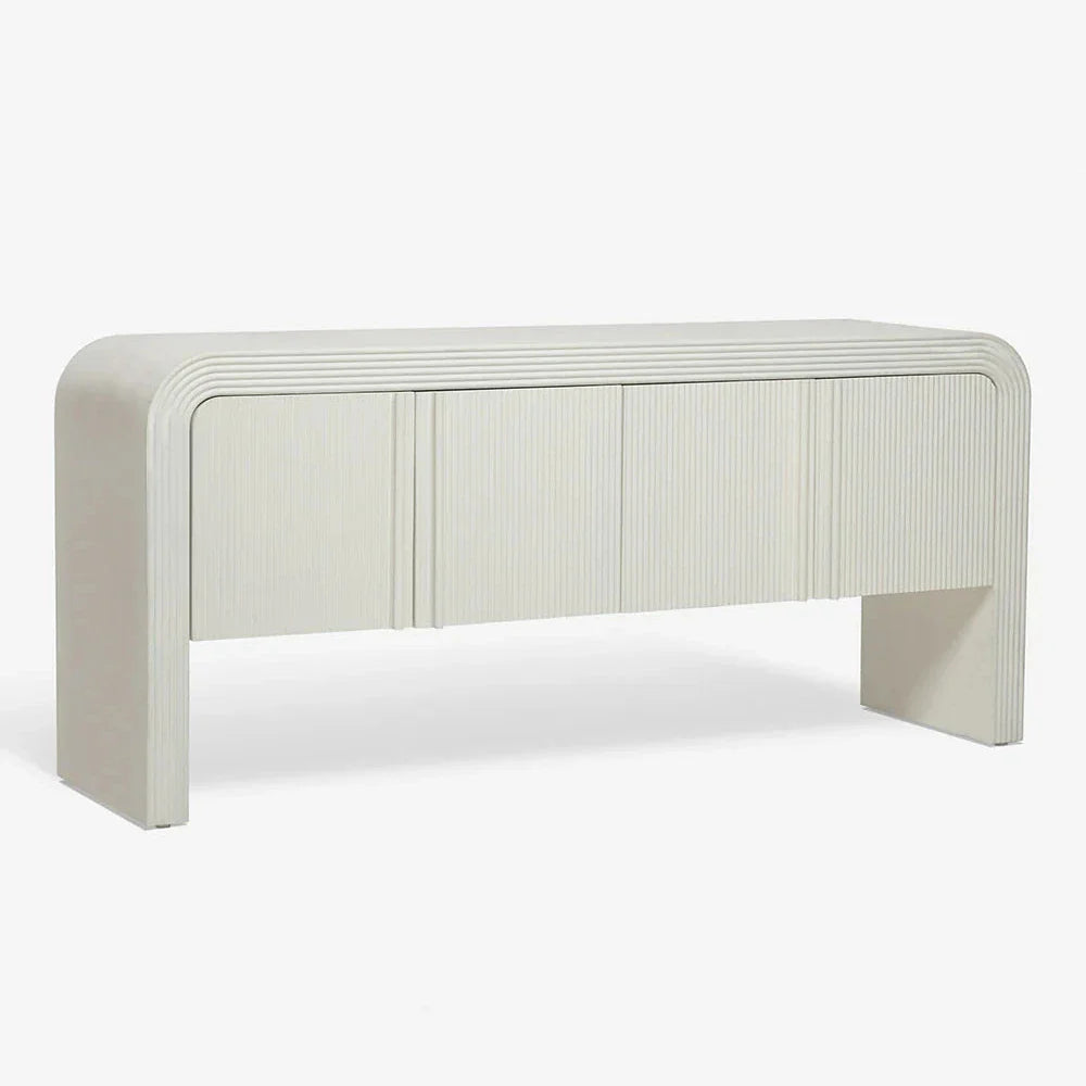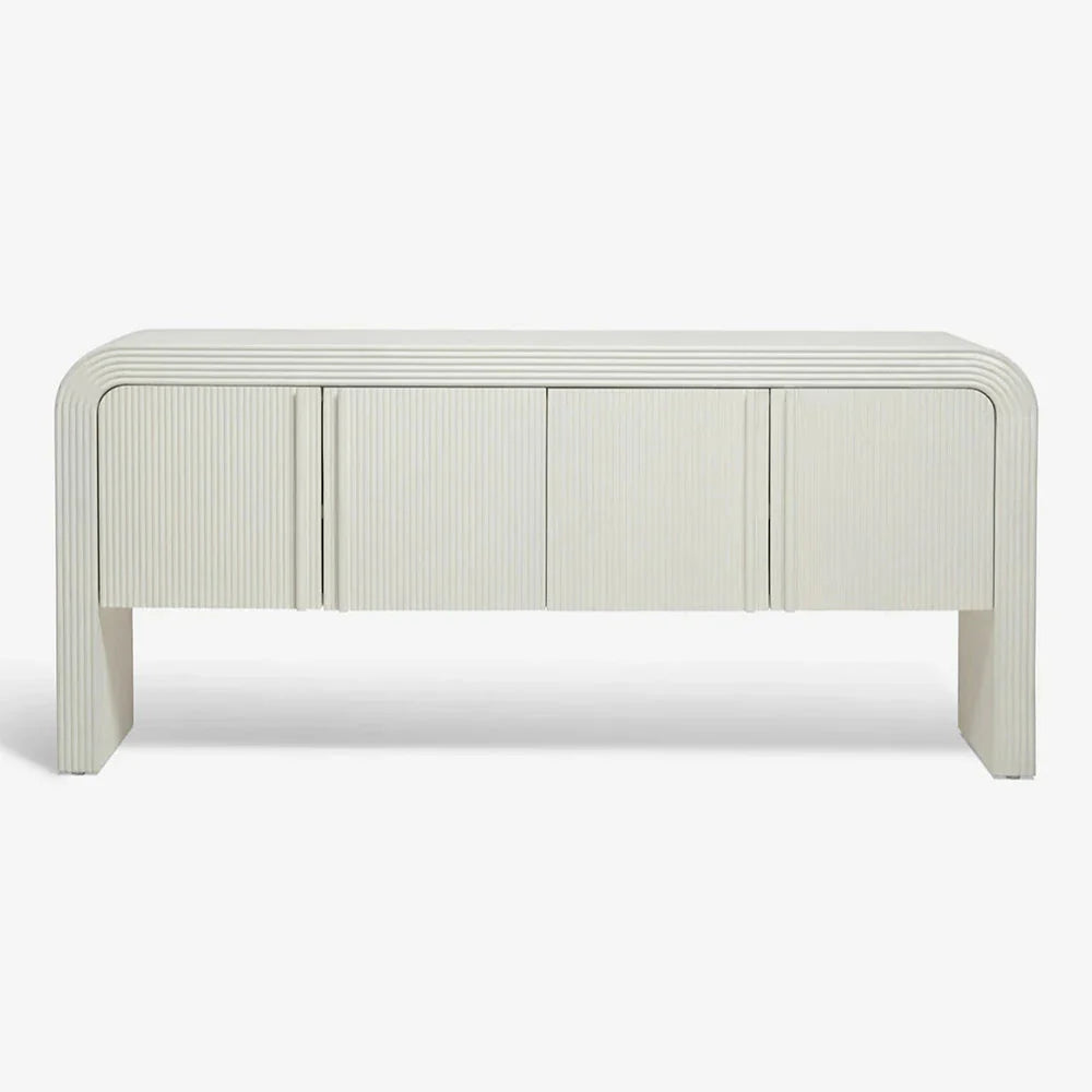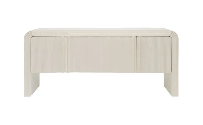 Elevate your space with the stunning Blanco sideboard! Crafted with deco-inspired woodwork and intricate ridged detailing, this piece exudes elegance. The spacious cabinet storage and rear cutouts make it a versatile addition to any room, perfect for holding media or organizing belongings. Add some flair to your home with the Blanco sideboard.