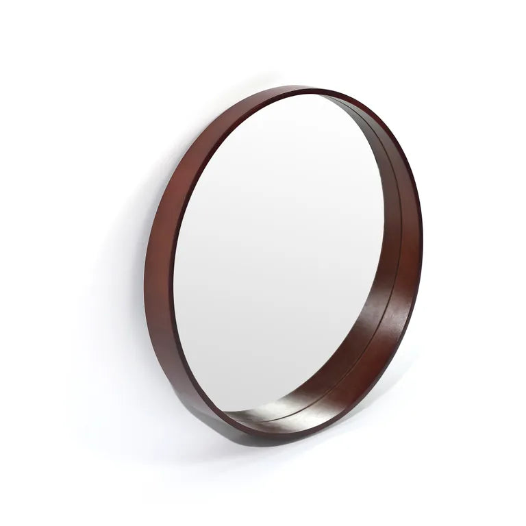 Elevate your home decor with the fusion of tradition and contemporary design in this round wall mirror. Crafted from warm walnut wood, it boasts a graceful curved shelf for added functionality and style.