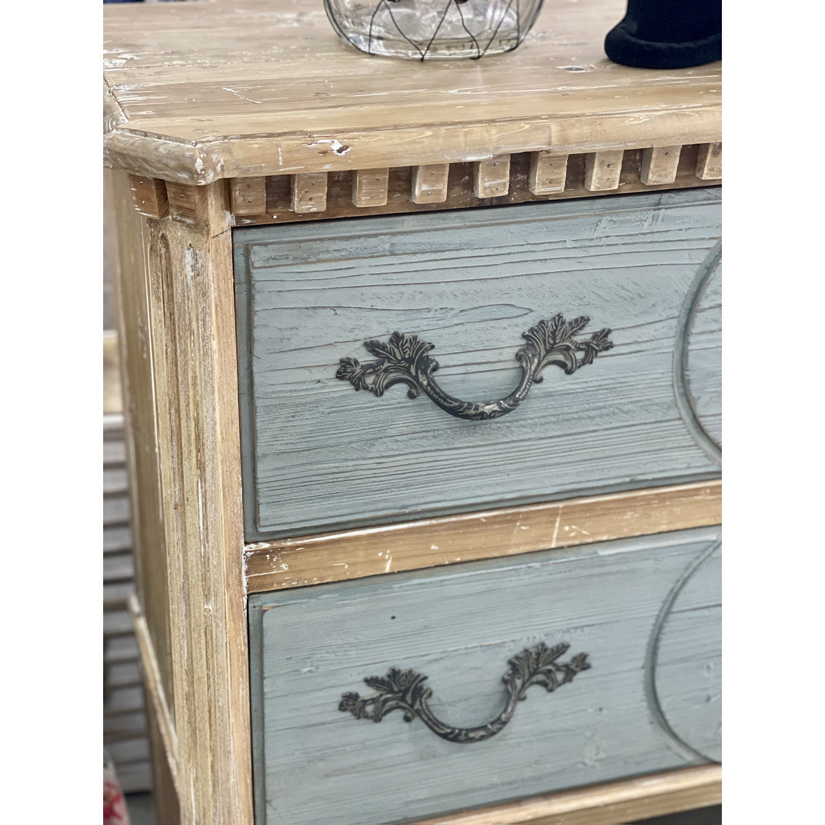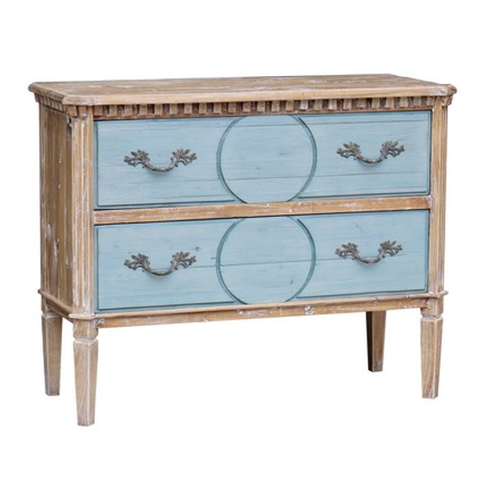 Functionality meets earthy design with this French country sea-salt blue, 2 drawer chest. The old pine and sea-salt blue adds warmth and a sense of antiquity to any space. Carefully constructed from old pine, this sturdy chest is a great storage option as well as visually appealing.