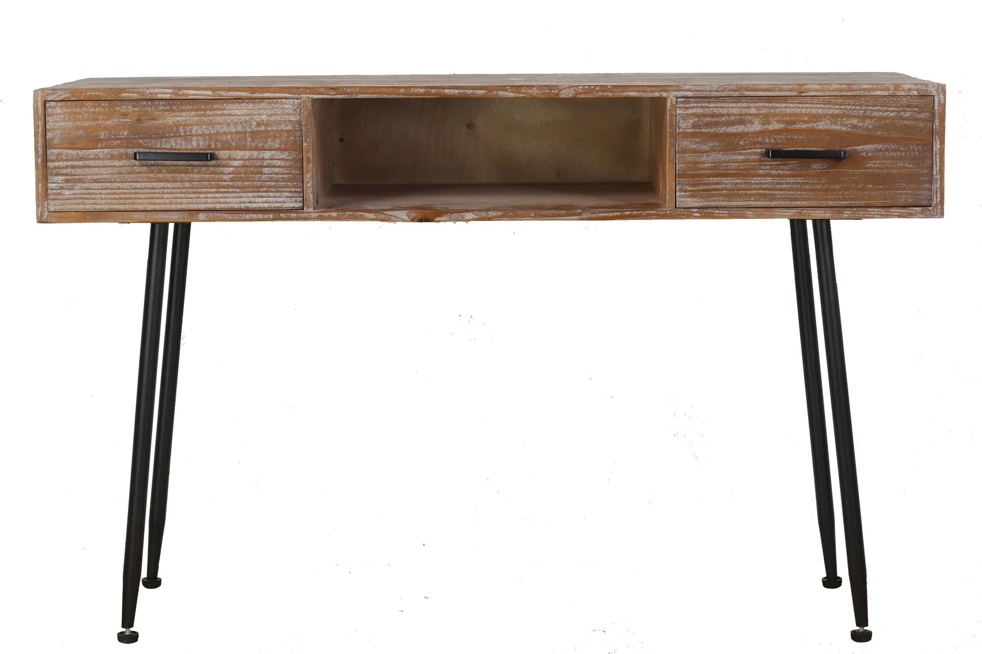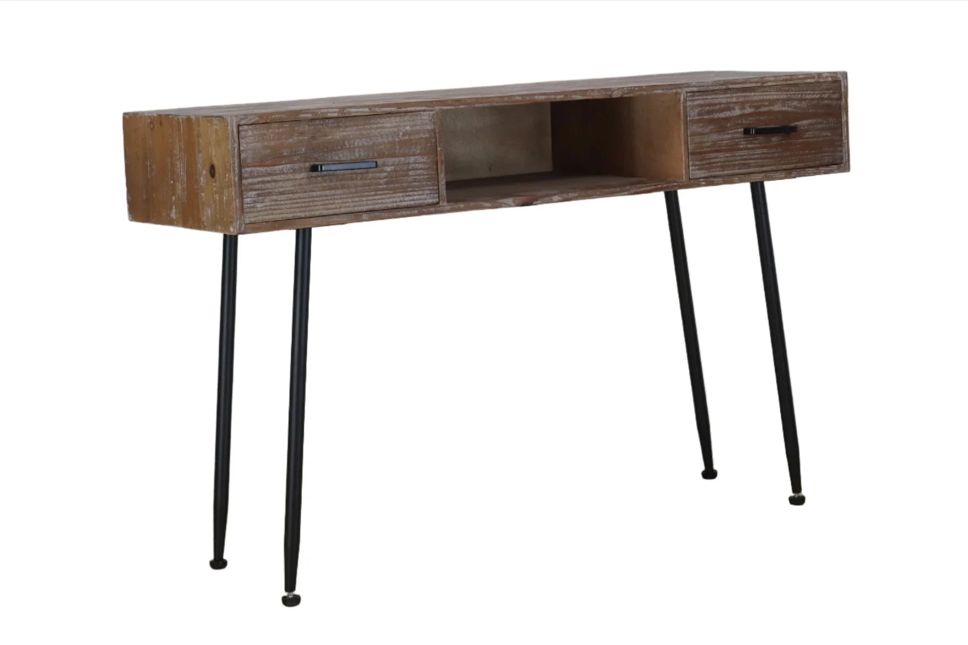 This eco-friendly hall table features sleek metal legs and a top crafted from recycled fir. Measuring 1.2m, it's the perfect size for a hallway or entryway. Add a touch of style and sustainability to your home with this unique and practical piece.