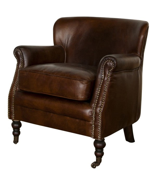 Made from south American top grain leather and a solid timber frame, with wonderful brass nail detailing. Crafted in a traditional style, this Mortimer armchair in vintage will add earthy tones and classic comfort to any lounge, office, or entertainment area.
