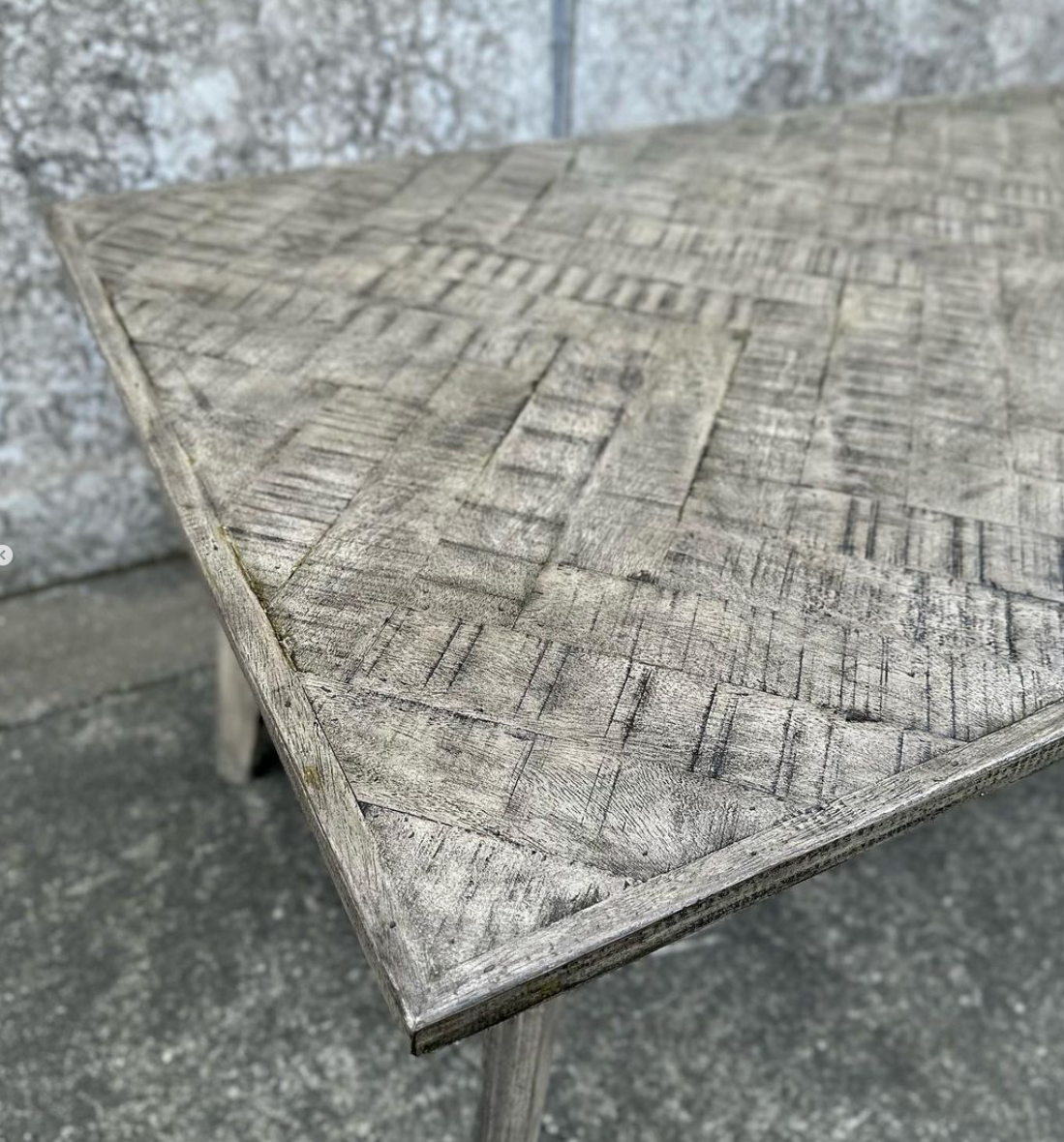 The Nordic Herring Bone Dining Table is an exquisitely crafted piece of furniture. Its grey finish and four leg base give it a stunningly sophisticated look, while the intricate herringbone design of the tabletop adds a touch of elegance. Made from solid reclaimed mango wood, this table is strong, durable and designed to last. Transform your dining room with this classic yet modern piece that is sure to be the envy of all your guests!