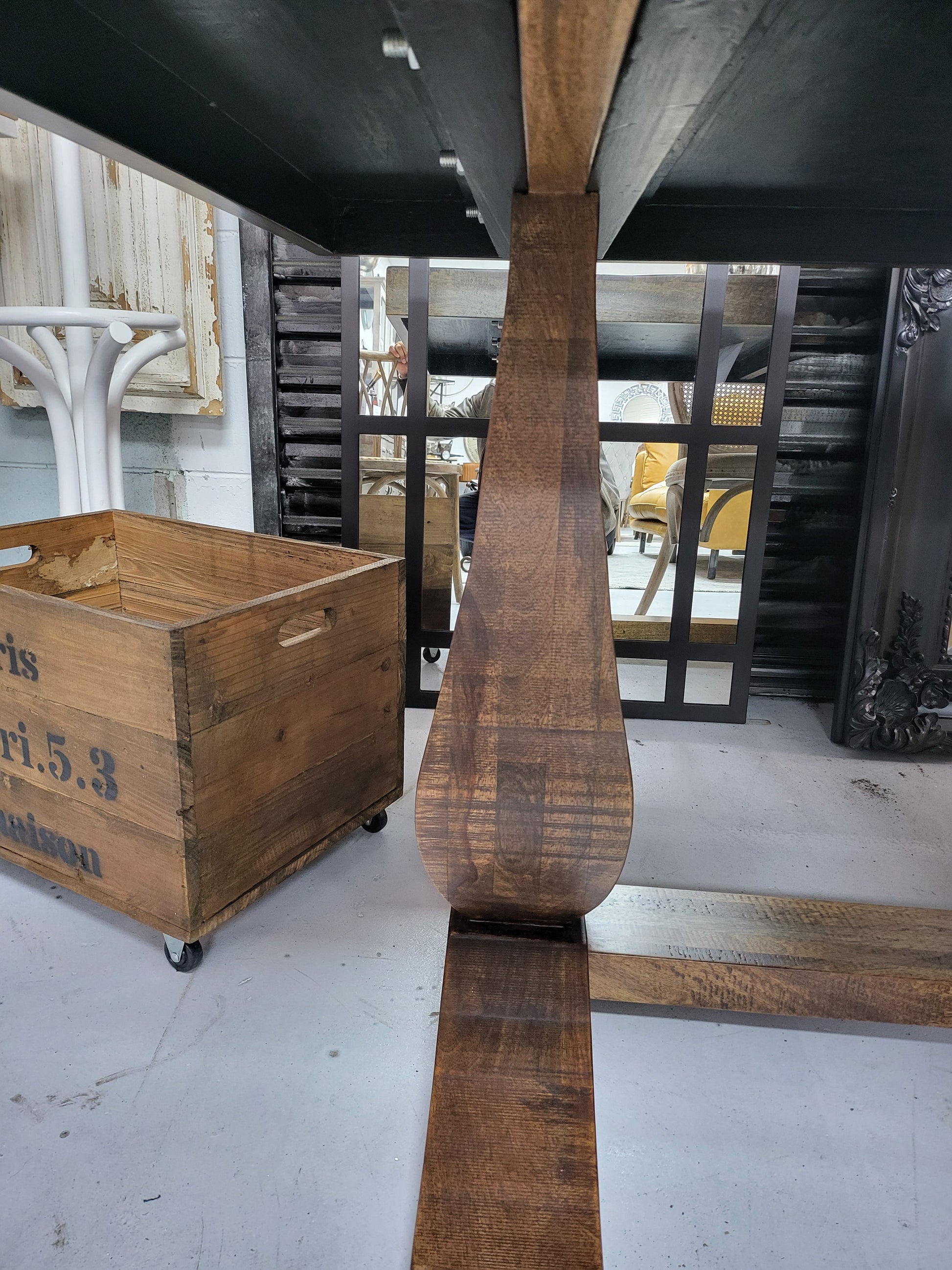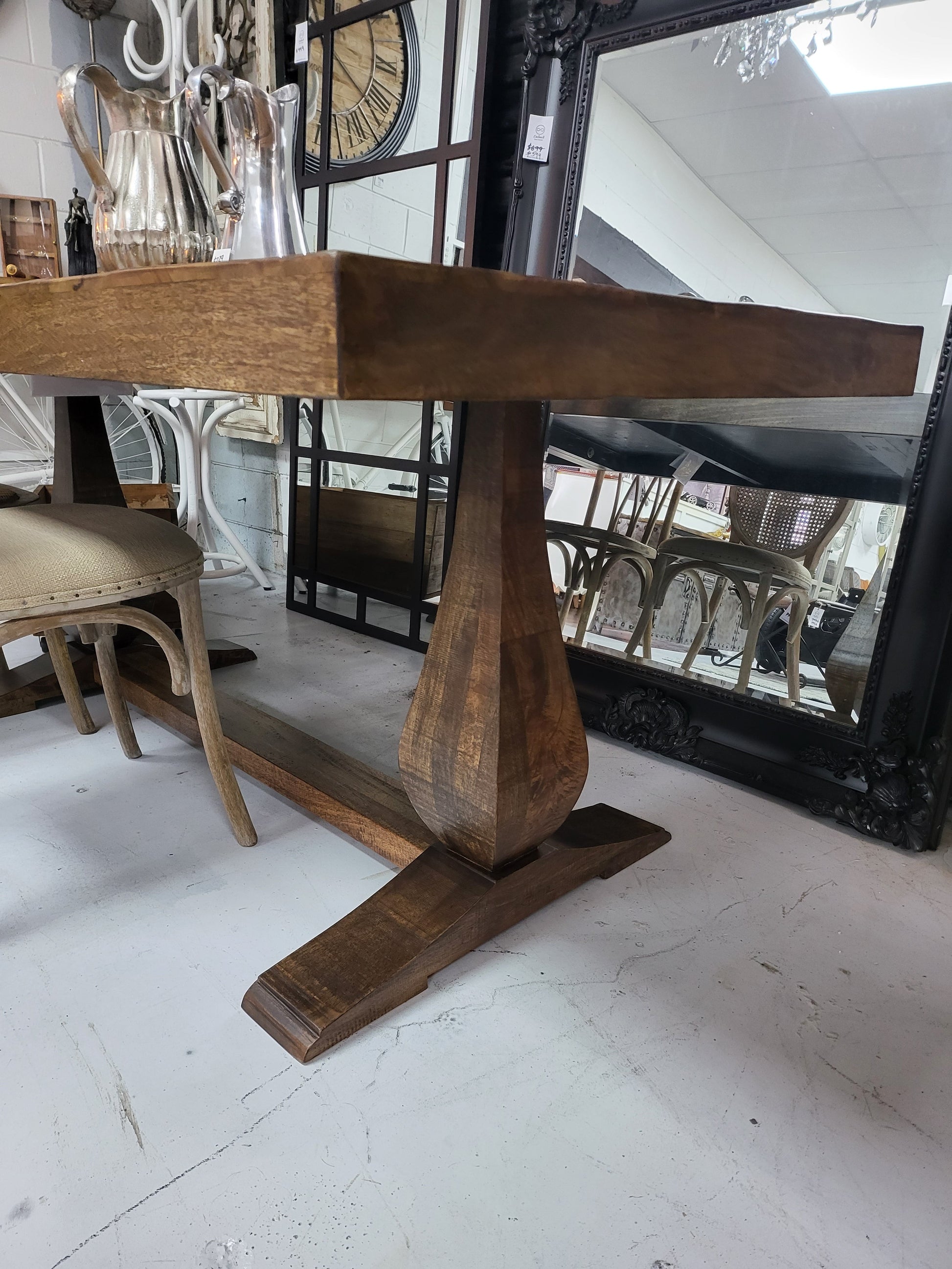 Evoking timeless sophistication, the Prairie Parquet Dining Table with Double Pedestal Base offers an incomparable design that carries modern materials. Each leg is crafted from reclaimed mango wood, providing a sturdy base for the delicate and intricate parquet tabletop with a chic walnut finish. Make your dining area the statement of your home with this truly remarkable piece.