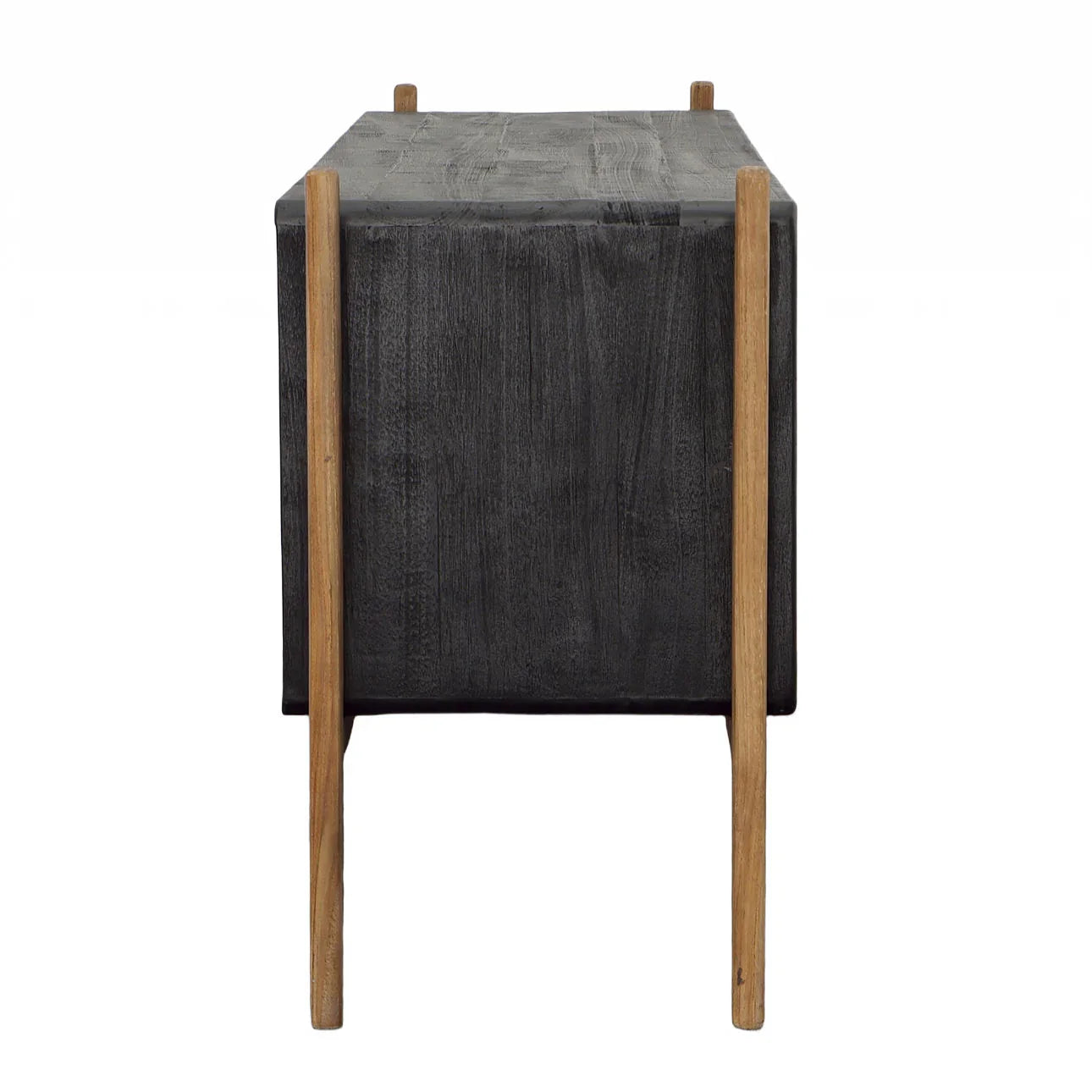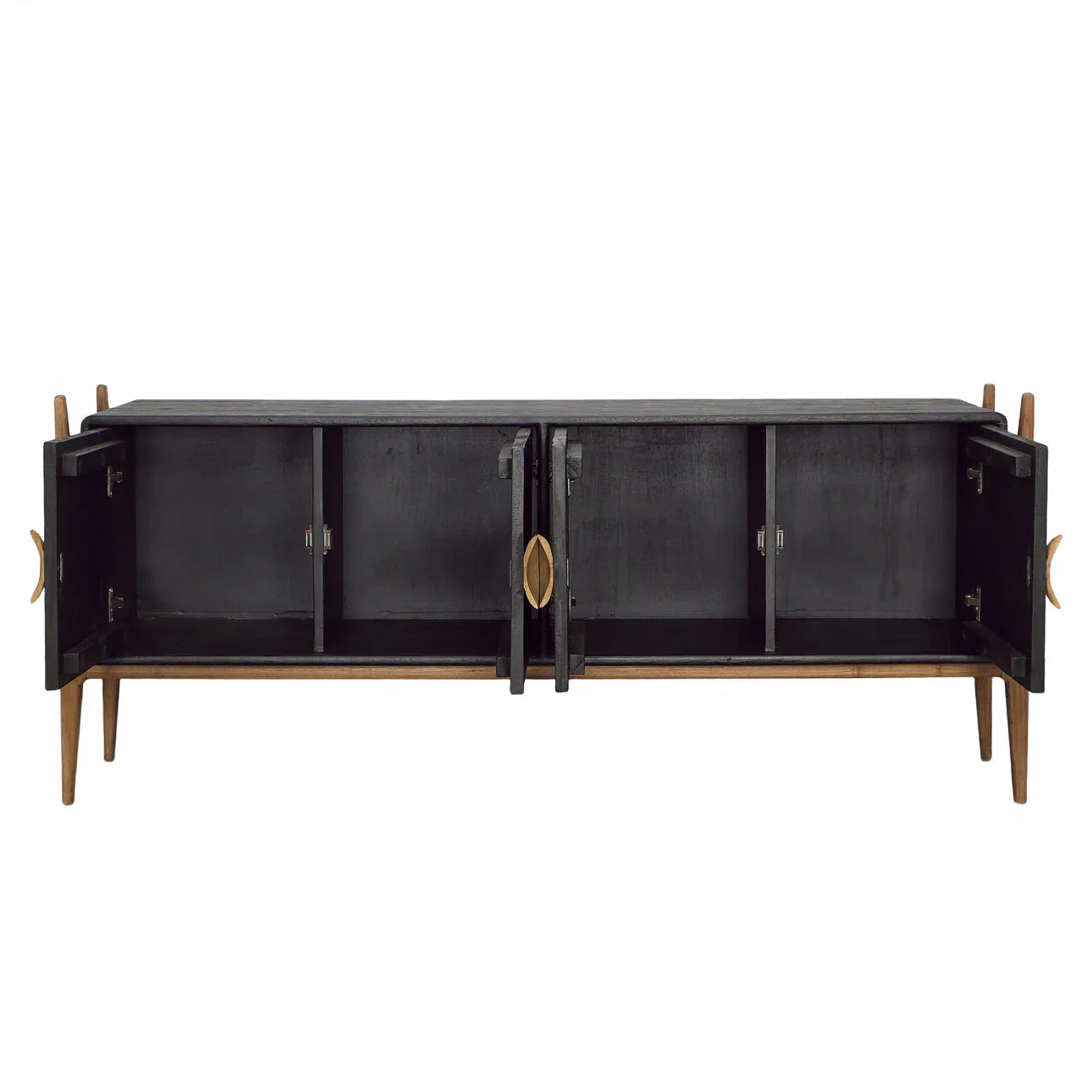 Introducing the exquisite Rosanna Sideboard, expertly crafted with a mix of exotic and teak wood. Boasting four-door fronts with circular wood handles, this piece offers both style and convenience. With spacious interior shelves, it's perfect for storing all your essentials while making a statement in any room. Experience luxury at its finest.