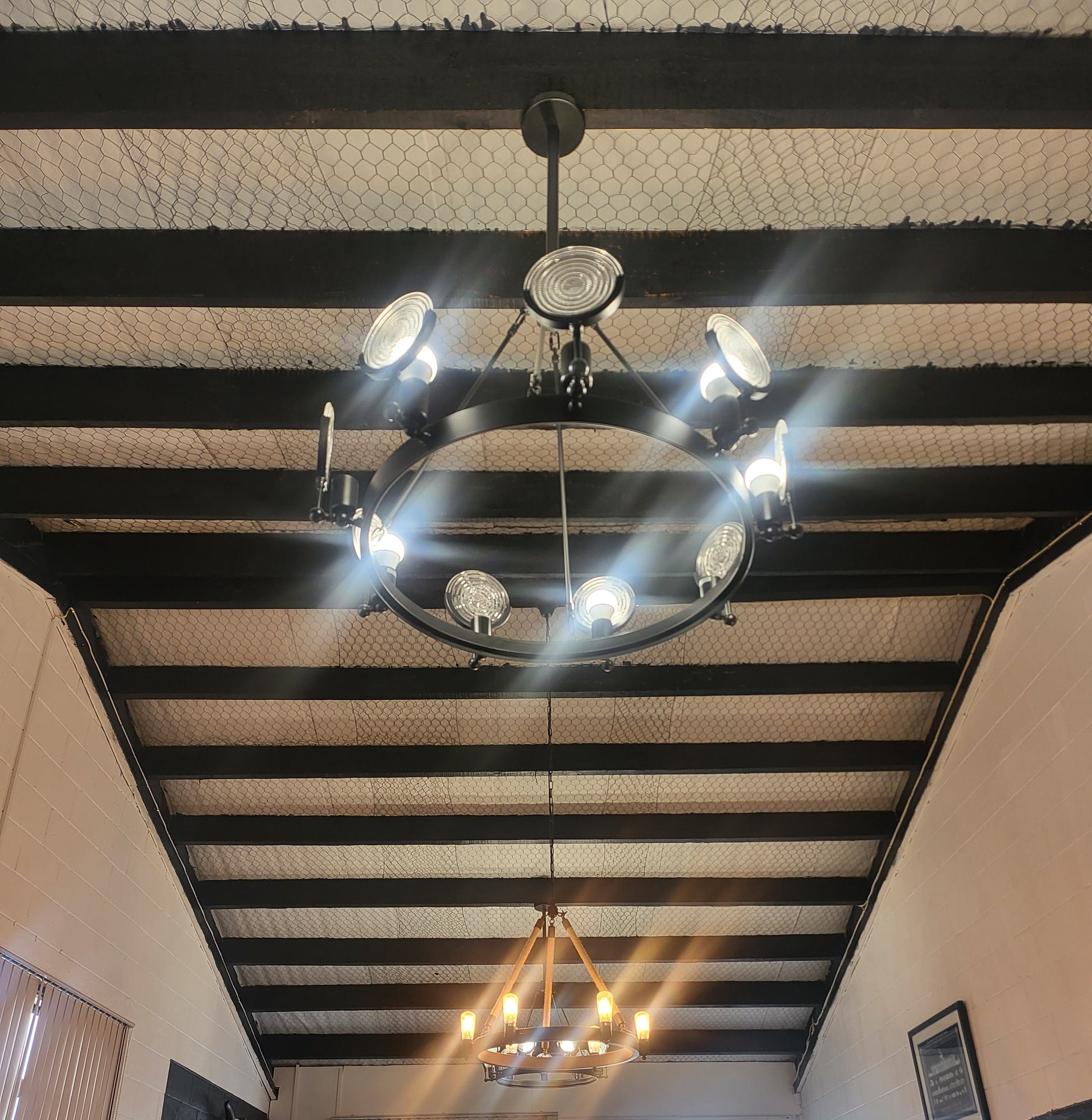 Industrial with a Deco twist this back iron pendant features 8 lights with filament bulbs behind an opaque round glass shade.
