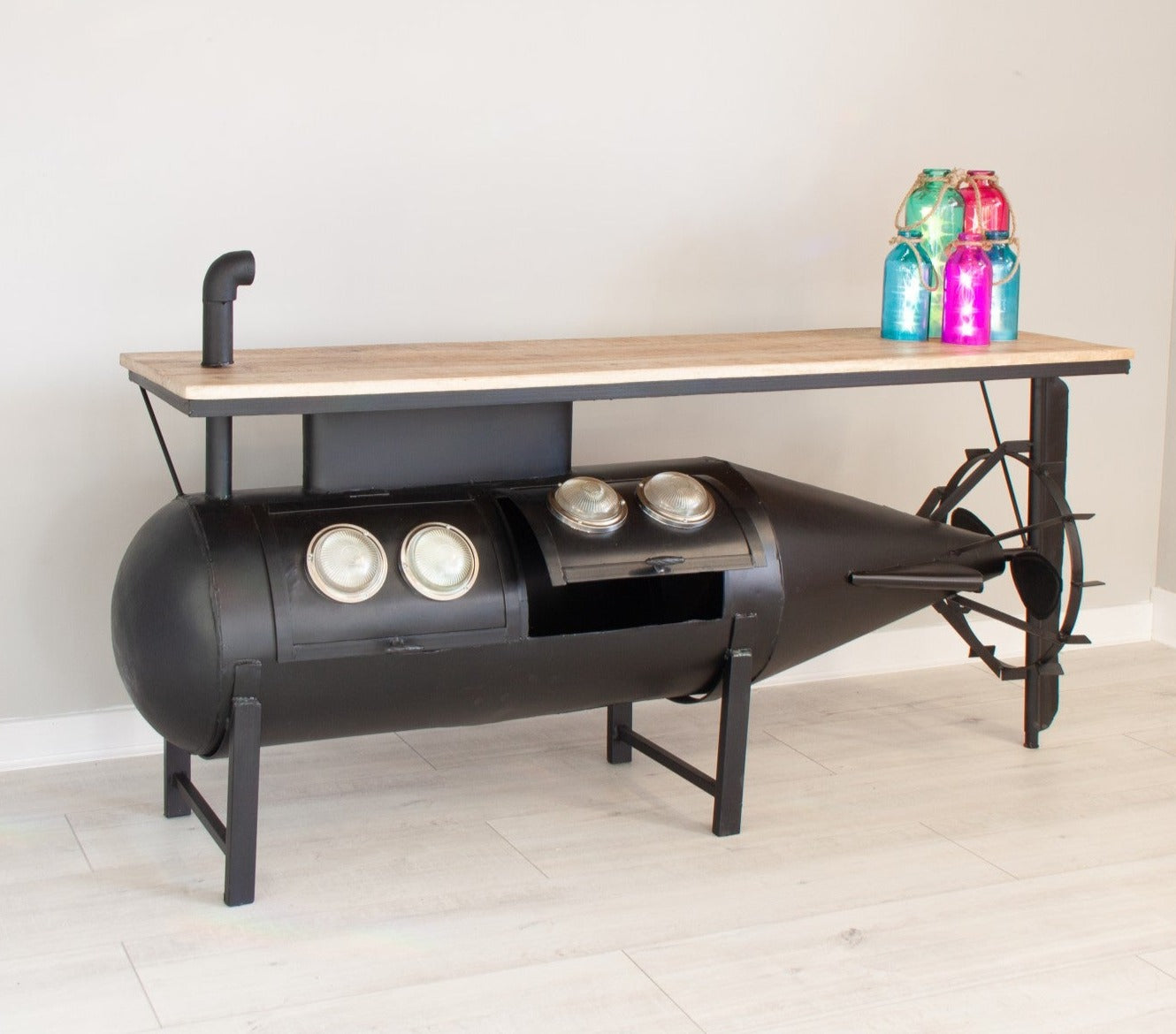 Make a statement with our Submarine Bar Table! Its sleek and sturdy metal base resembles an underwater vessel, while the wooden top adds warmth and texture. Perfect for serving drinks and snacks, this unique design will make your bar, restaurant, or home stand out. Elevate your space with this eye-catching piece!