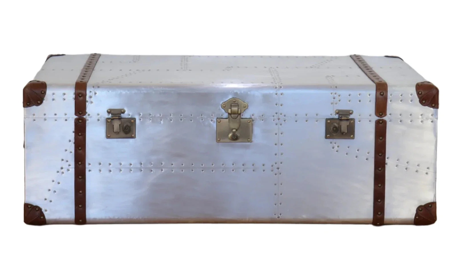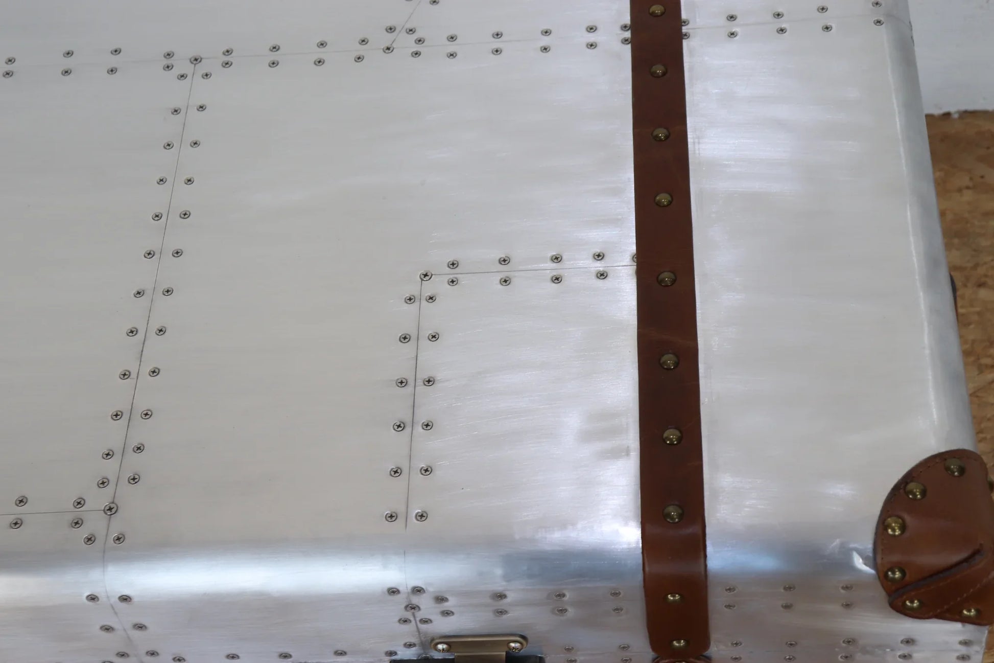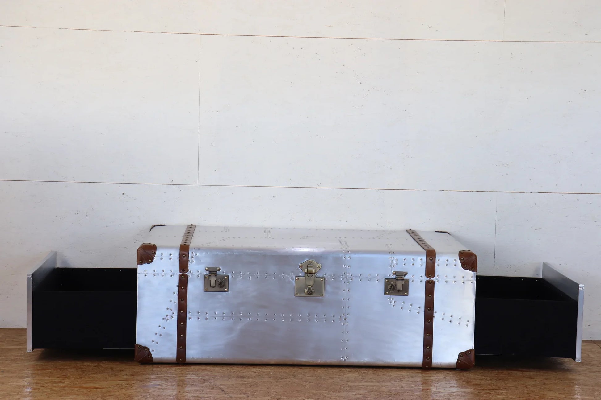 Experience luxurious craftsmanship with our Trunk Coffee Table. Made by hand with aluminum and genuine leather, this stunning piece features 2 soft closing drawers for added convenience. Elevate your living space with this unique and stylish masterpiece.