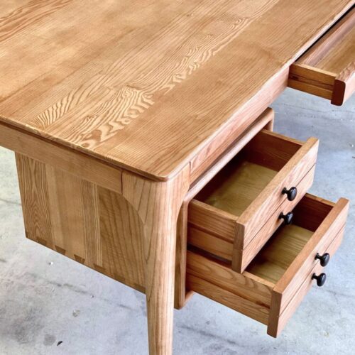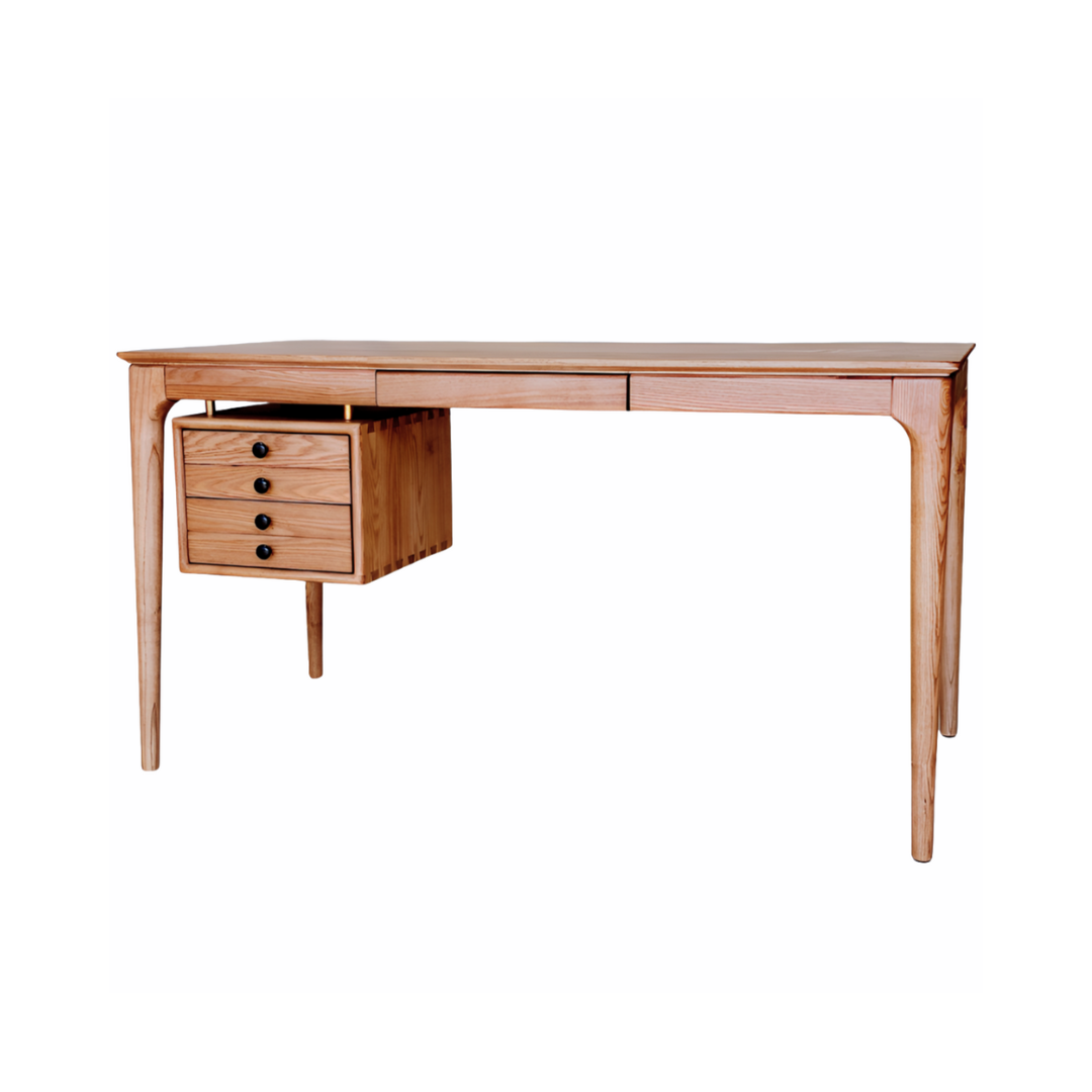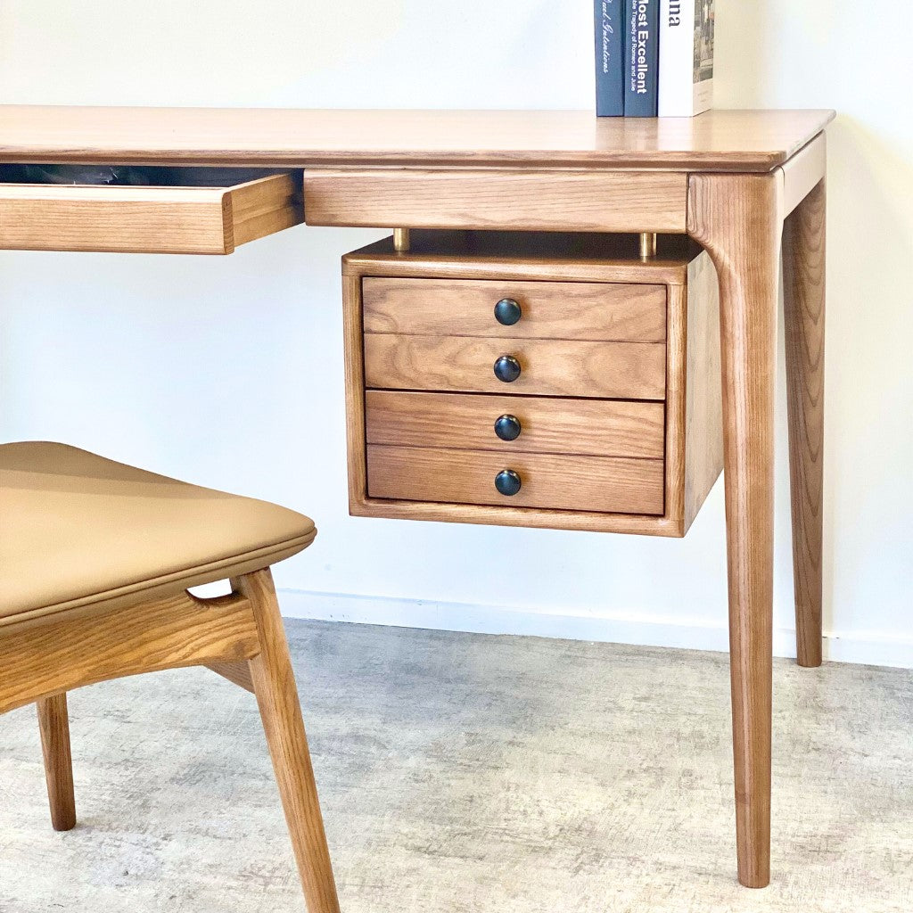 This beautifully crafted desk boasts a sleek mid-century design with wide appeal. Its distinctive character is enhanced by tapered legs, beveled edges, and a floating drawer unit. Made from luxurious American ash wood with a rich walnut stain, this piece is a true work of art, perfect for any room in your home.