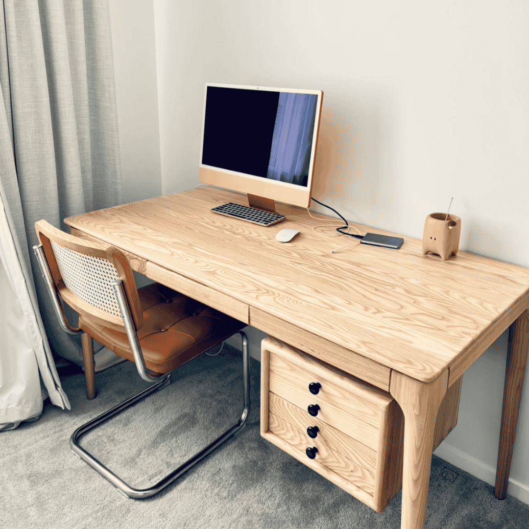 This beautifully crafted desk boasts a sleek mid-century design with wide appeal. Its distinctive character is enhanced by tapered legs, beveled edges, and a floating drawer unit. Made from luxurious American ash wood, this piece is a true work of art, perfect for any room in your home.