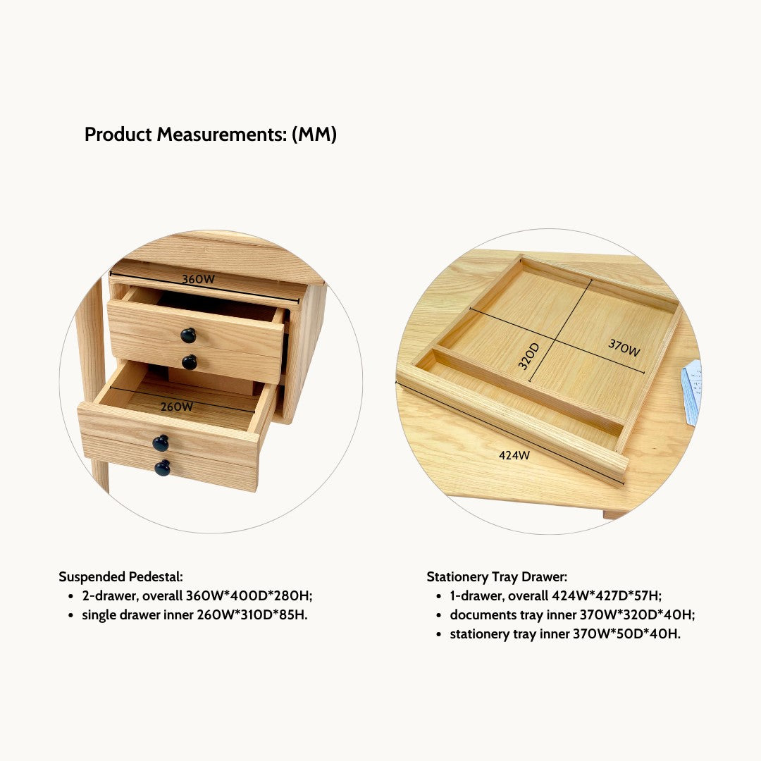 Customizable Storage: Features a suspended two-drawer pedestal that can be installed on either side for flexibility. The additional center stationery tray ensures quick access to essentials while keeping your space organized and clutter-free.
